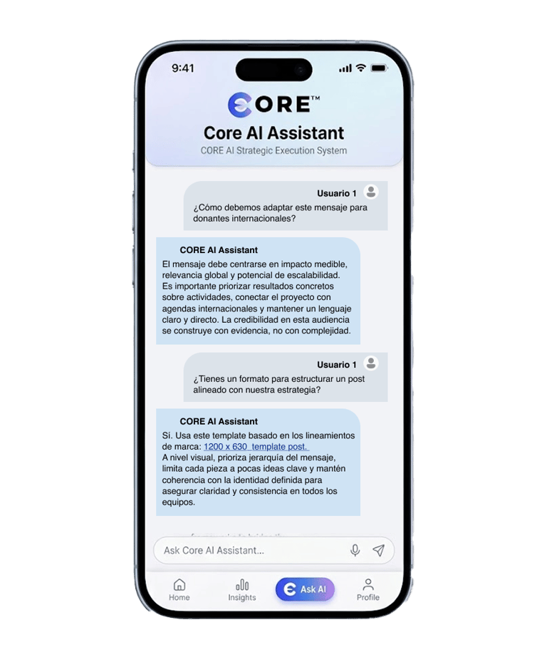 El CORE™ AI Assistant transforma los entregables estratégicos en una herramienta práctica para el equipo, facilitando decisiones, alineación y ejecución en tiempo real.